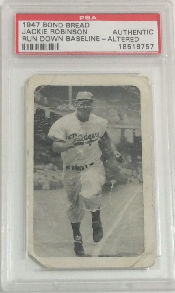 "Bread Bonds Jackie Robinson Run Down Baseline" Rookie Baseball Card has his face on the both sides of the card.  One of a few exists today.